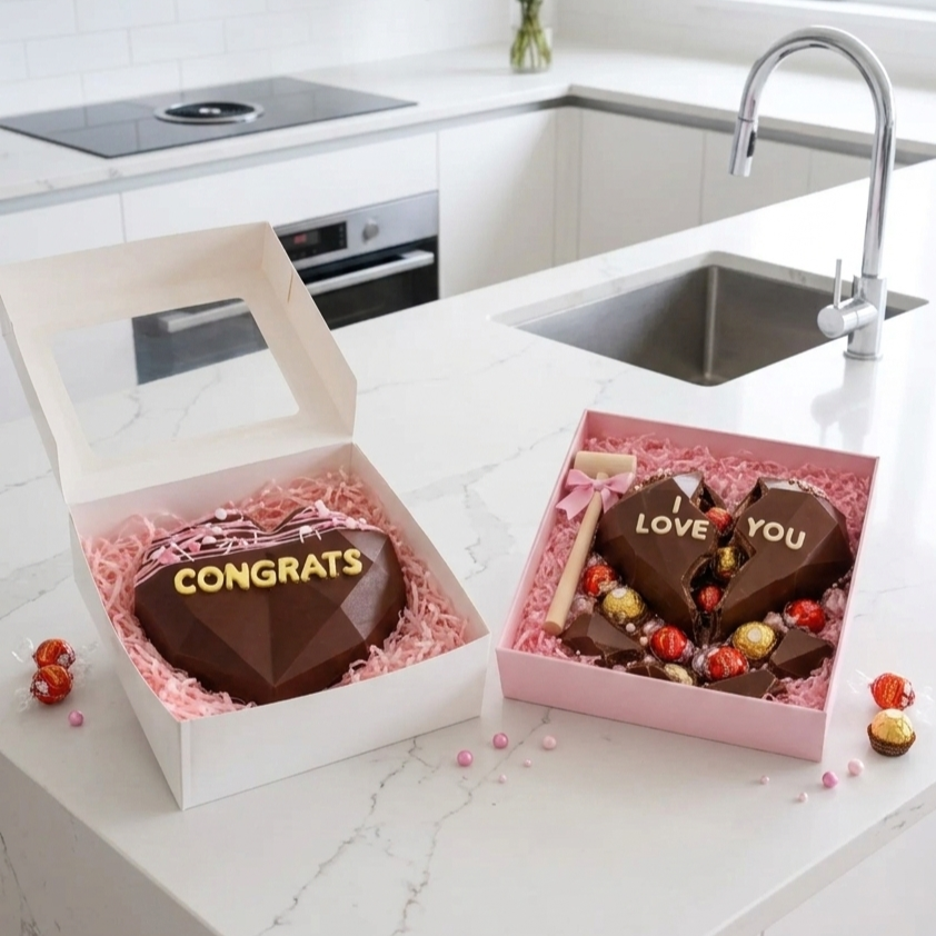 Elevate your next celebration with our handcrafted geometric chocolate heart. Designed for the “perfect smash moment,” this luxury chocolate gift box is more than just a treat—it’s an interactive experience. Each breakable chocolate heart is made to order using premium ingredients and finished with elegant drizzles and pearl sprinkles.